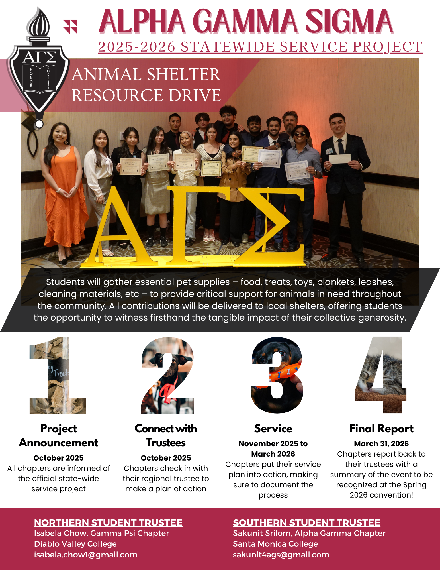 On behalf of the Northern and Southern Student Trustees they would like invite all chapters to participate in this year's AGS Statewide Service Project for 2025-2026. Here is the flyer to share with your students. The Student Trustees contact information is listed below. Please direct any questions regarding the project to them. They would very happy to hear from all chapters!